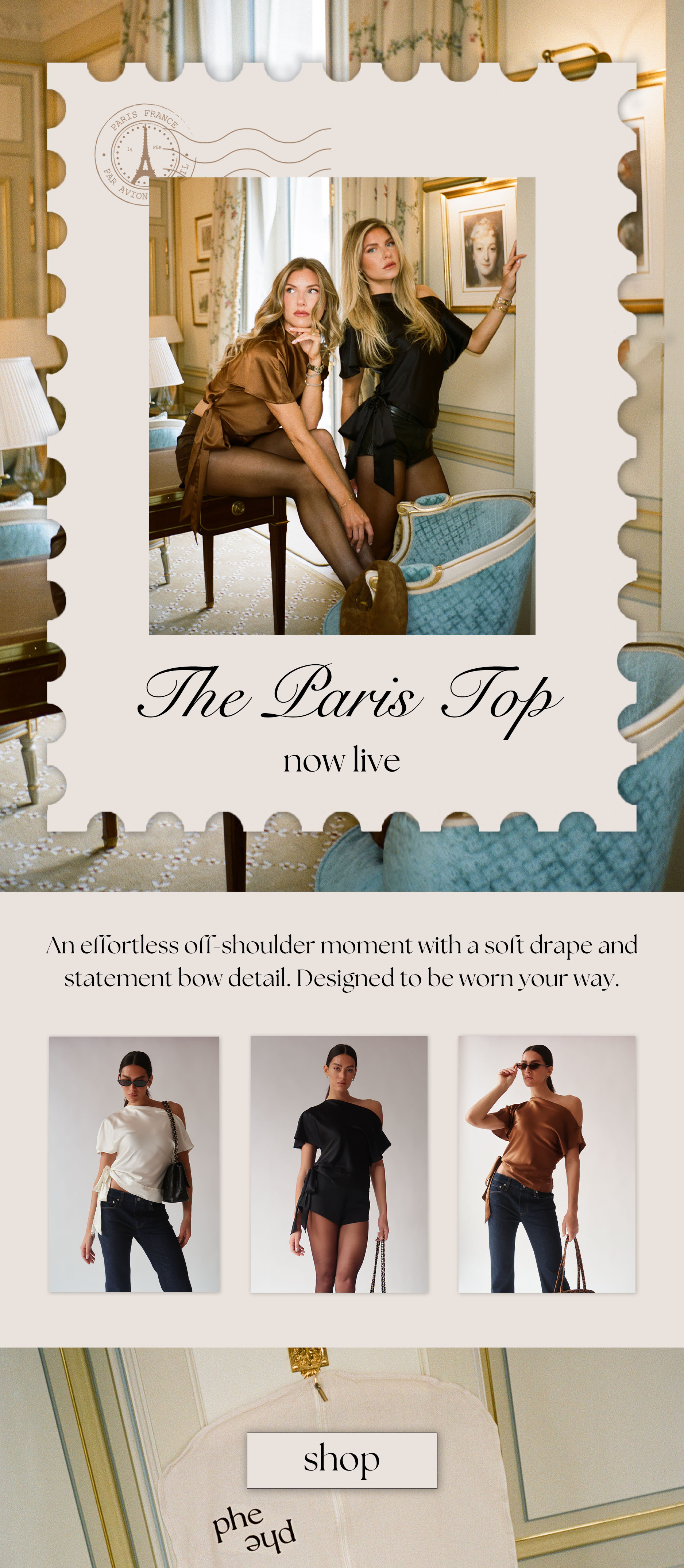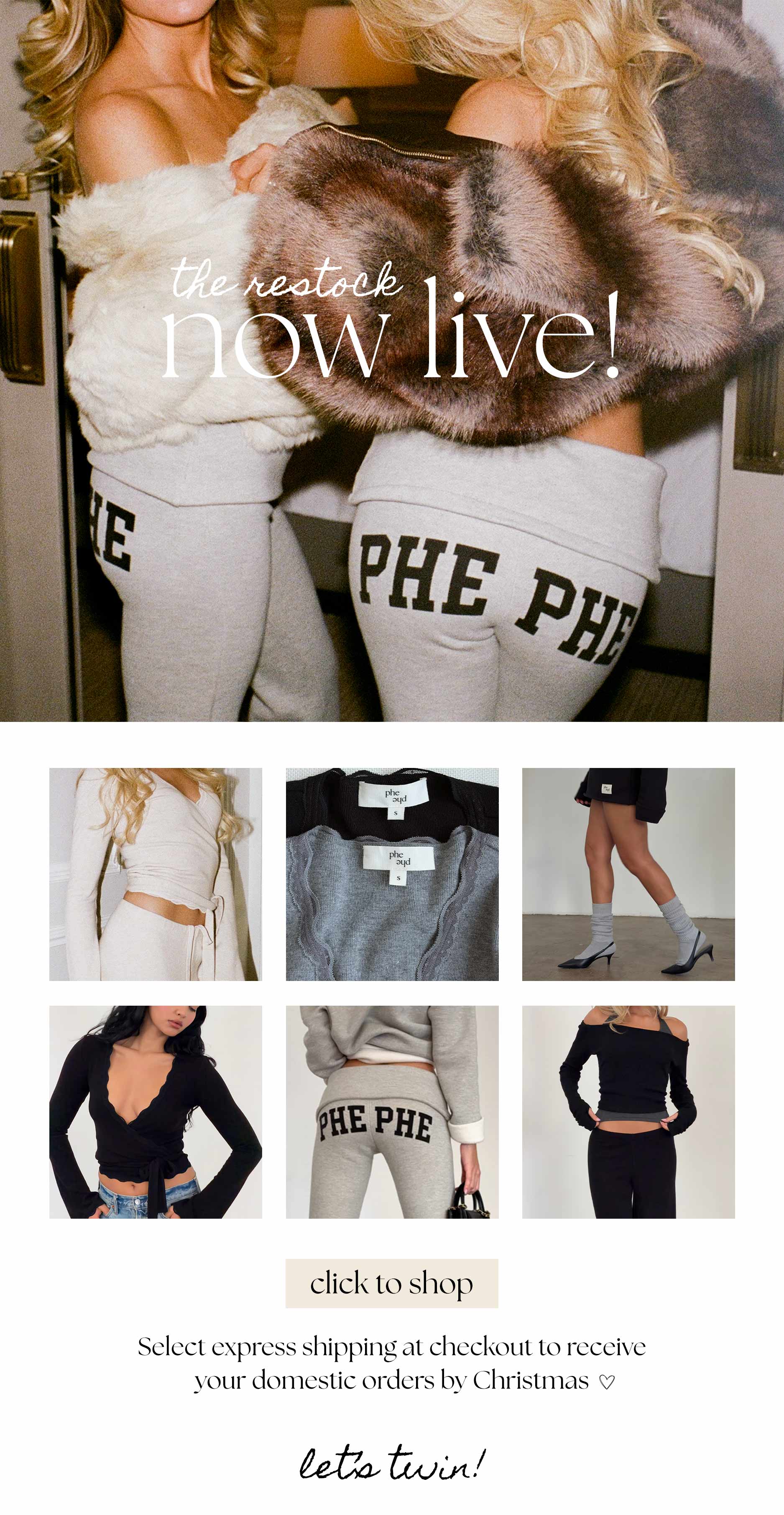 Phe Phe is a NYC-based clothing brand founded by Brigette and Danielle Pheloung. I support the brand through email and SMS marketing, creating thoughtful, on-brand campaigns that align with each launch and collection.